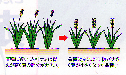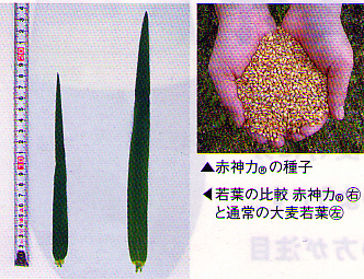 - その中で赤神力は大麦の原種に近い品種で背丈が高く、葉も大きく、幅広、肉厚で柔らかいと言う青汁素材としては最適の若葉を持っていました。