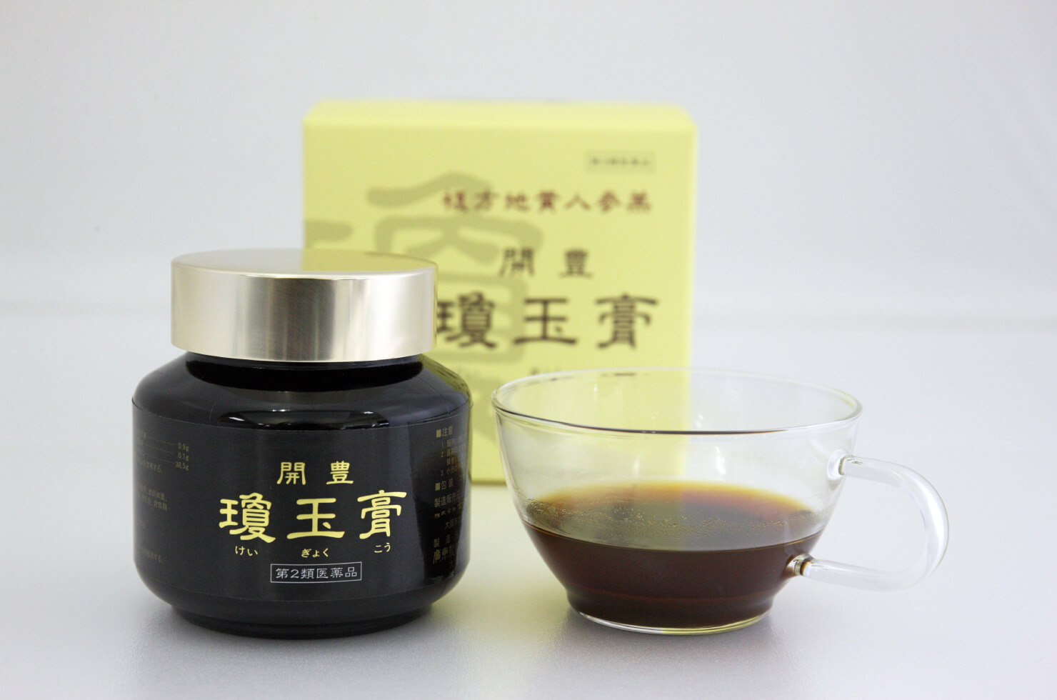 ・地黄 補血・強壮の薬として血を補う作用があり貧血や虚弱体質の改善に使用したり、血が薄くて体力がない人にも処方されます。 血液をろ過して尿の生成を調節している腎を補う働きもあります。 腎と髪の毛は密接な関係を持ていまして、腎が元気であると髪の毛も艶やかで張りがあり白髪になりにくくなります。 ・人参 補気、健脾、強壮などの効能があり、疲労や体力の低下、食欲不振、消化不良などに用いられています。 高麗人参は消化機能や免疫をつかさどる脾を元気にして消化吸収の働きを調節します ・茯苓 利水、健脾、安神の効能があり、浮腫(むくみ)、食欲不振、消化不良、動悸、不眠などに用いられています。 地黄が身体に良い水(潤い)を供給し、茯苓が悪い水(浮腫など)を排出することにより体内の水分バランスを正常に保ちます。 ・枸杞子 枸杞の実は枸杞子(くこし)とよばれ、「補肝腎・明目」の薬効があるとされ、肝と腎を補い、目に良いとされています。目は肝臓の血の滋養に依存すると同時に、肝の機能状態を目に反映すると言われており、肝血不足の場合、目がかすむ、夜盲症、目の乾燥感や異物感、視力減退などの症状が現われます。 ・沈香 理気薬に分類され、理気とは気の流れを調節しつつ、その流れを良くする効能をいいます。 気の巡りが悪いとせっかく身体にとって良いものを与えられても、それを活用できません。 沈香が加わっていることで気の巡りをスムーズにして地黄・人参・枸杞子・茯苓などの薬の効果を高めることが出来ます。 ・蜂蜜 Q 効き目はすぐに実感できますか? A 虚弱体質の方でもご使用いただけるお薬ですので、作用は穏やかです。 個人差はございますが、すぐに効果を感じられる方もいらっしゃいますし、継続して服用していただくことで効果を感じられる方もいらっしゃいます。 Q 副作用はありますか? A 瓊玉膏はお薬ですので、副作用が全くないわけではございません。 ご不安なことがございましたら薬局で薬剤師にご相談の上お買い求めください。 Q 瓊玉膏はどのようにして製造されていますか? A 瓊玉膏は生地黄の搾汁やその他生薬粉末を混合して72時間加熱し、手間暇かけて製造しているお薬です。 |