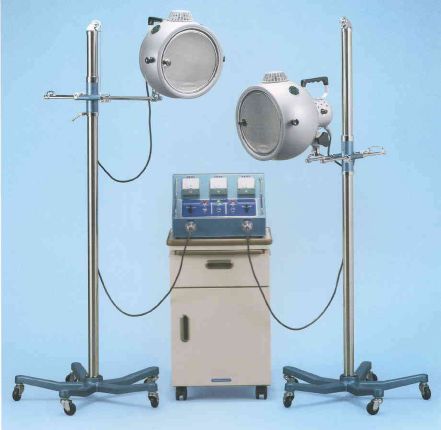●当店はコウケントー(株)様と直接取引をしておりますのでアフターフォローについてもきちんと対応させていただきます。 コウケントーは太陽光線に似た連続スペクトルの光線を照射する治療器です。 太陽光線は赤外線・可視光線・紫外線が大部分でどれも人体に必要なものです。 これらの有用な光線を効率よく作り出し簡単に取り扱うことを目的にカーボンアーク灯を応用してあります。 治療器用カーボンのアーク放電により、太陽光線とよく似た光(可視総合光線=赤外線・可視光線・わずかな紫外線)を人体皮膚表面に照射するものです。 この人工光線には人体に有害な短波長の紫外線(UV)が含まれていません。 照射方法や治療器用カーボンにより目的に応じた治療を行います。 写真は1号機(家庭用タイプ)です。 照射器の部分を支柱に沿って85cmまで調節できますのでベッド・イスを利用して治療を受けることができます。